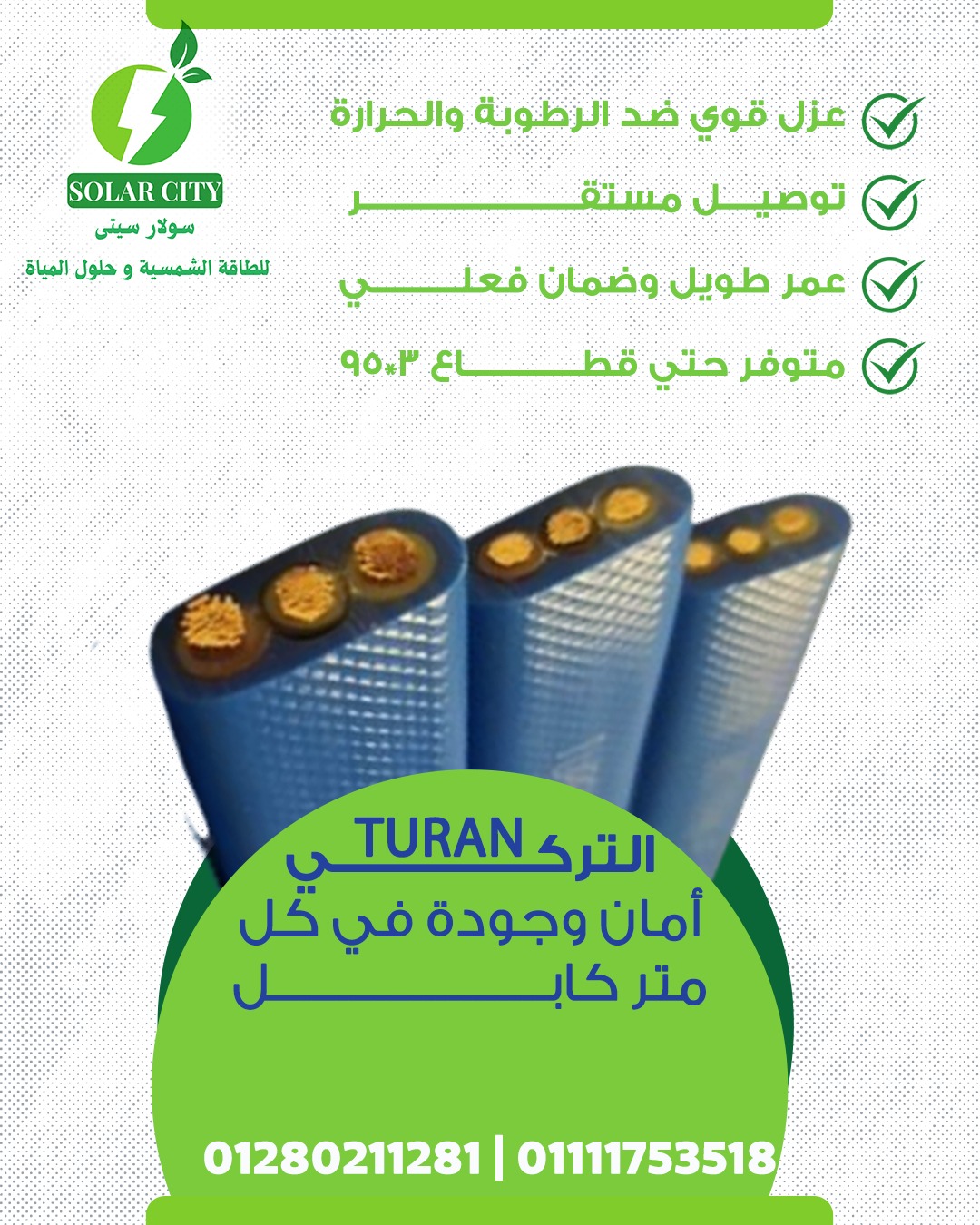 علشان كده سولار سيتي بتعتمد على كابلات تركية الصنع من ماركات موثوقة زي Turan Bahari،